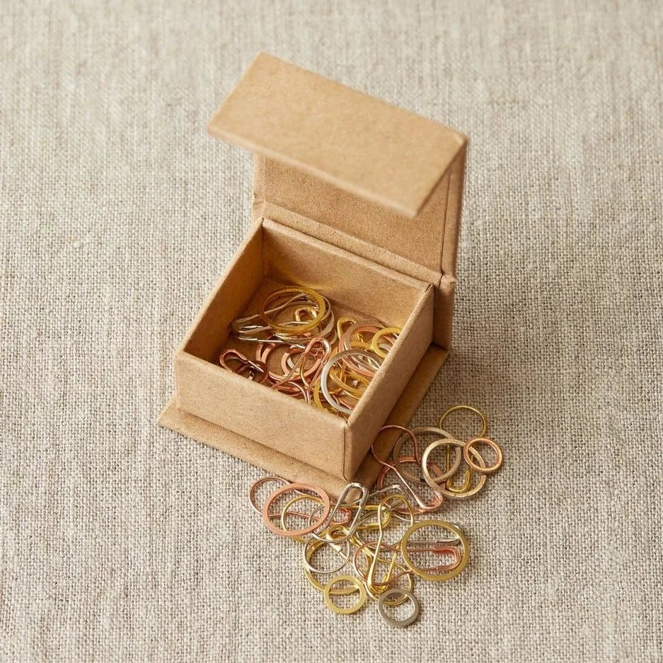 Maskemarkører fra Cocoknits i metal i hhv. guldfarvet, sølvfarvet og kobberfarvet. De kommer i en fin lille æske med magnetlukning.